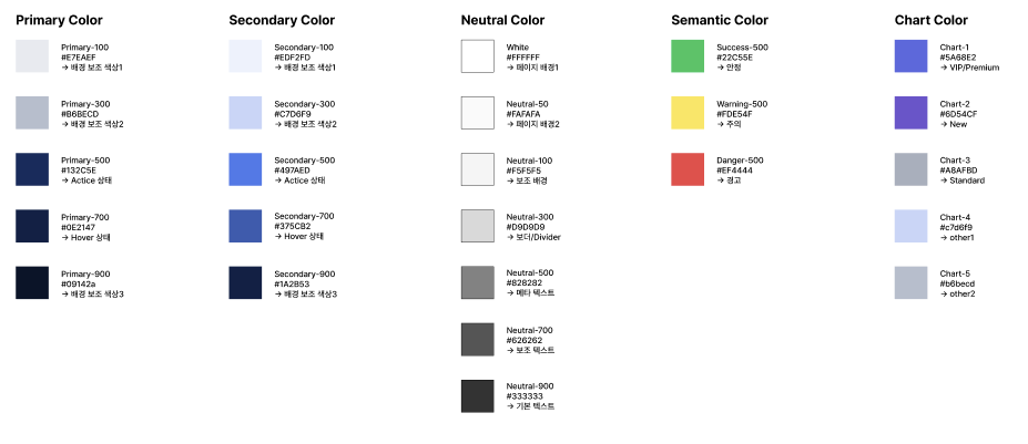 - Semantic Color → 성공, 경고, 취소 등 UI 상태와 의미를 사용자에게 직관적으로 전달하기 위한 색상입니다.
