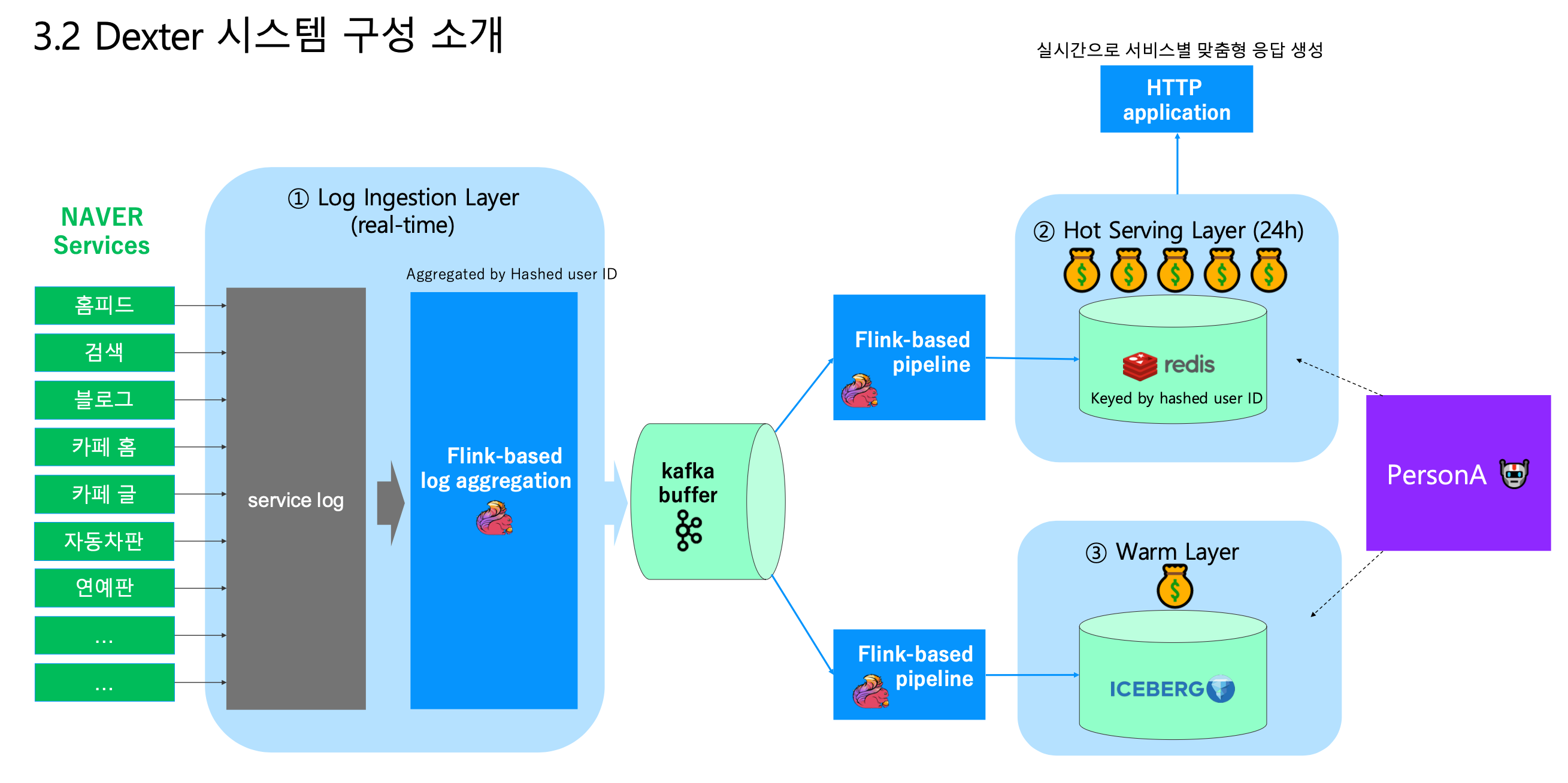 저희는 로그 수집 파이프라인을 설계할때 어떻게 추천 시스템까지 이어질까 고민이 되는 와중에, 네이버의 개인화 추천 서비스인 Dexture 시스템에서 소개된 개념을 참고했습니다.