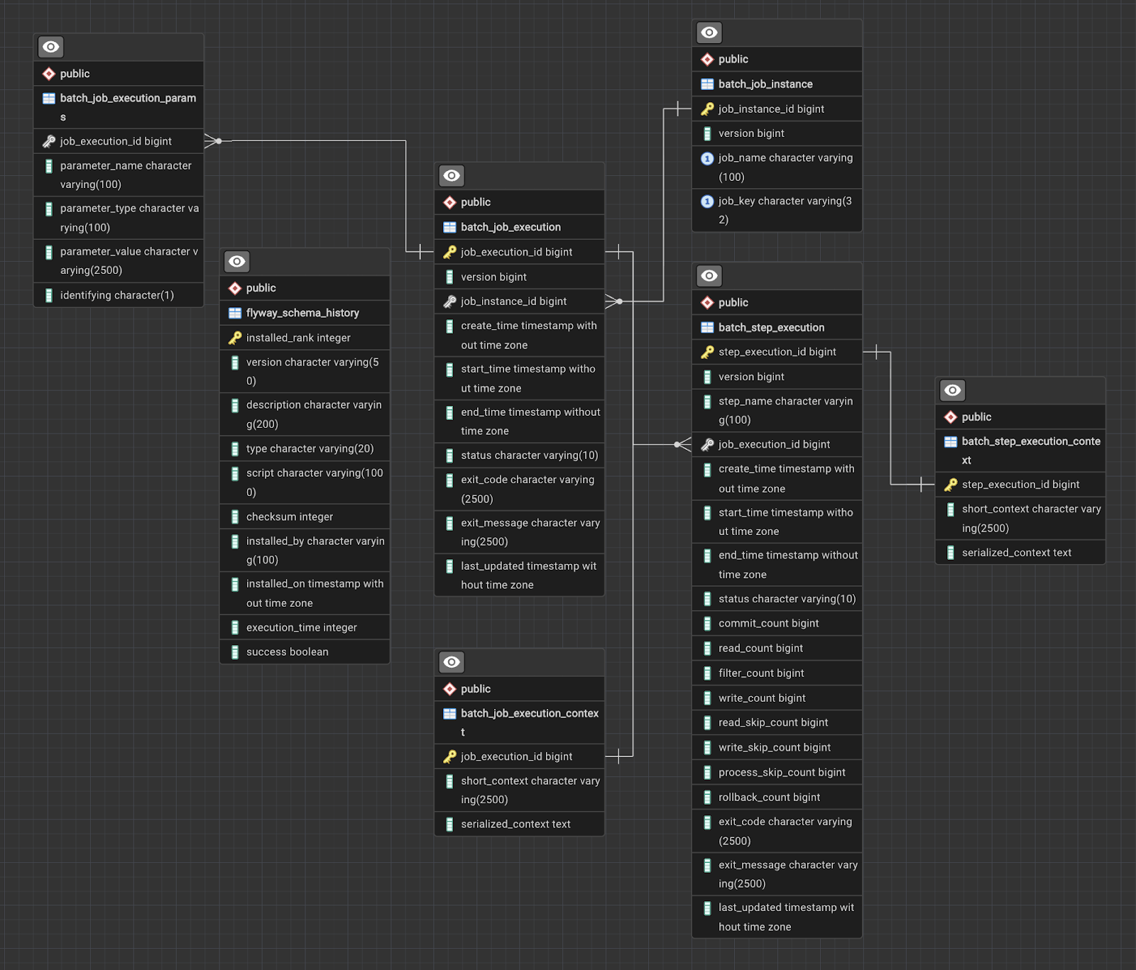 batch_job_instance,batch_job_execution,batch_step_execution등은 스프링 배치 프레임워크가 기본적으로 생성하는 테이블들입니다. 페르소나 스코어링이나 매일 밤 실행되는 정산/통계 배치 작업들의 성공/실패 여부와 실행 컨텍스트를 추적합니다. - Flyway 형상 관리: