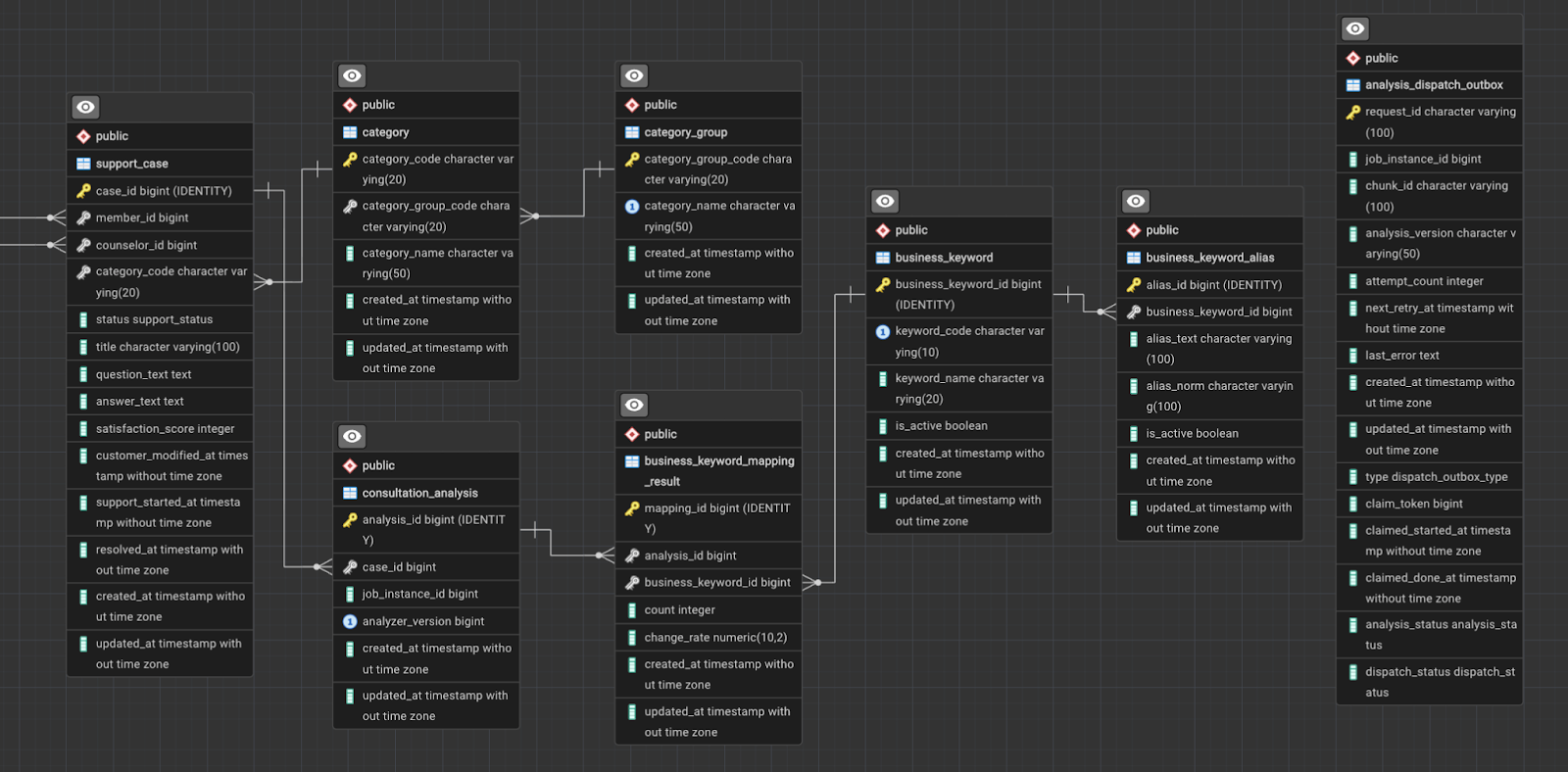 support_case테이블을 통해 고객의 문의와 상담원의 답변, 처리 상태(Status), 만족도 등을 관리합니다. - 키워드 사전 및 매핑: