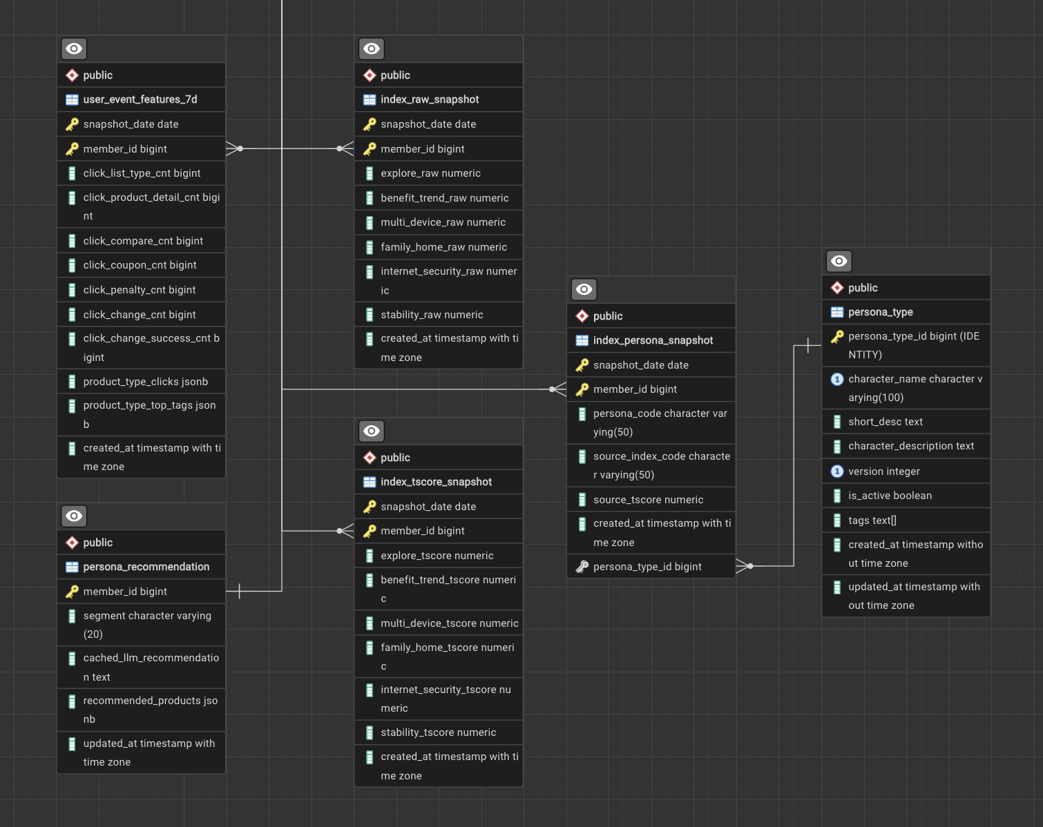 persona_type에 정의된 특정 캐릭터(예: 가성비 추구형, 프리미엄 선호형 등)를 고객에게 부여하고index_persona_snapshot에 이력을 남깁니다. - LLM 맞춤 추천: