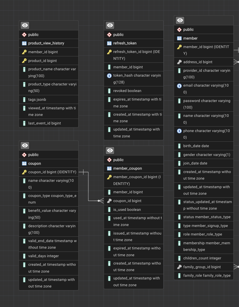 member와product의 N:M 관계를subscription(구독) 테이블로 풀어내어 가입/해지 이력을 추적합니다. 또한usage_monthly를 통해 월별 데이터/음성 사용량(jsonb활용)을 관리합니다. - 가족 결합 및 과금: