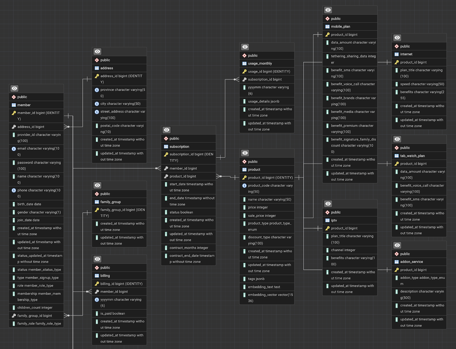 product라는 마스터 테이블을 중심에 두고,mobile_plan(5G/LTE),internet,iptv,tab_watch_plan,addon_service등 세부 상품 타입별 테이블을 1:1로 매핑하여 상품 확장에 유연하게 대처했습니다. - 구독 및 사용량 관리: