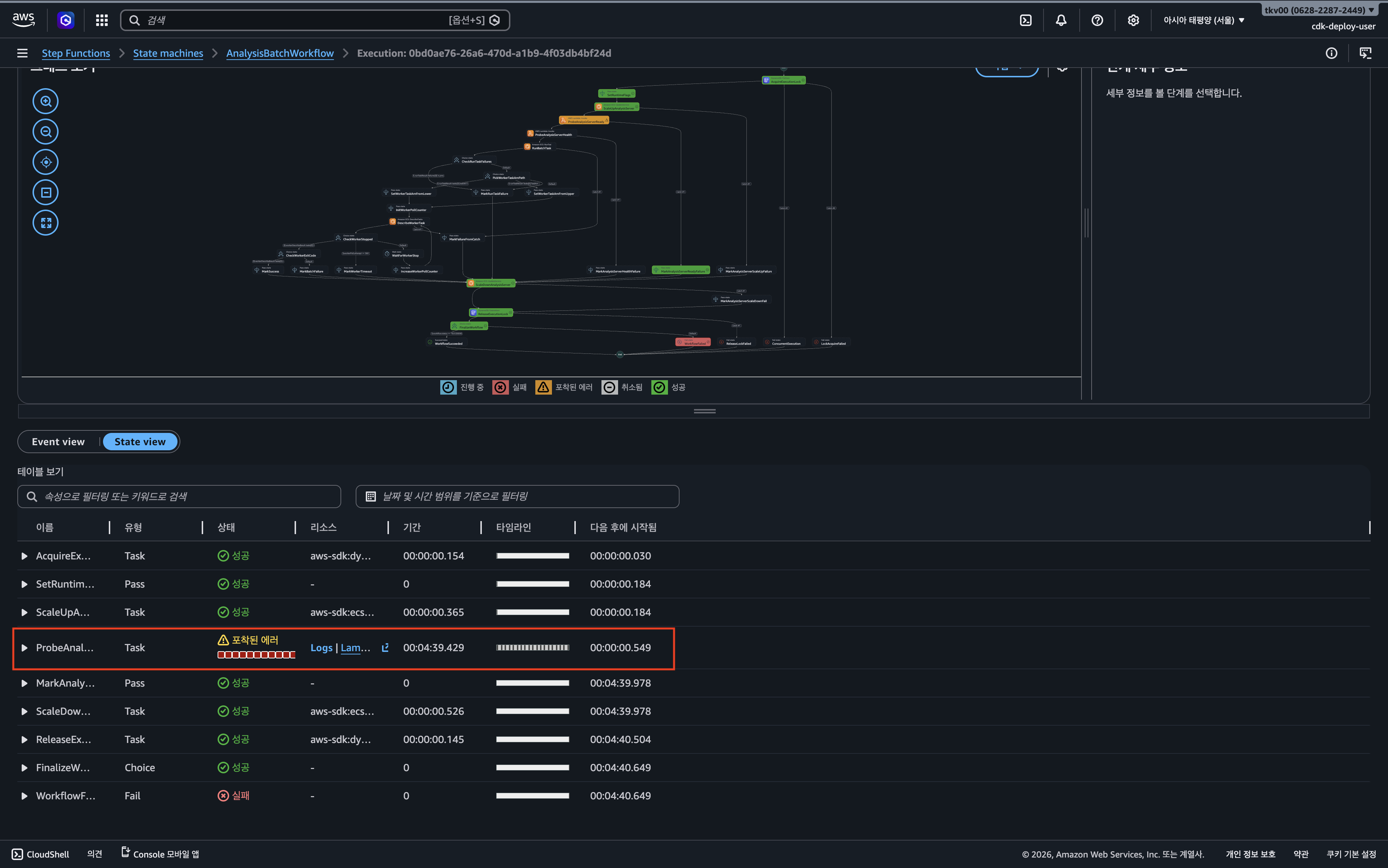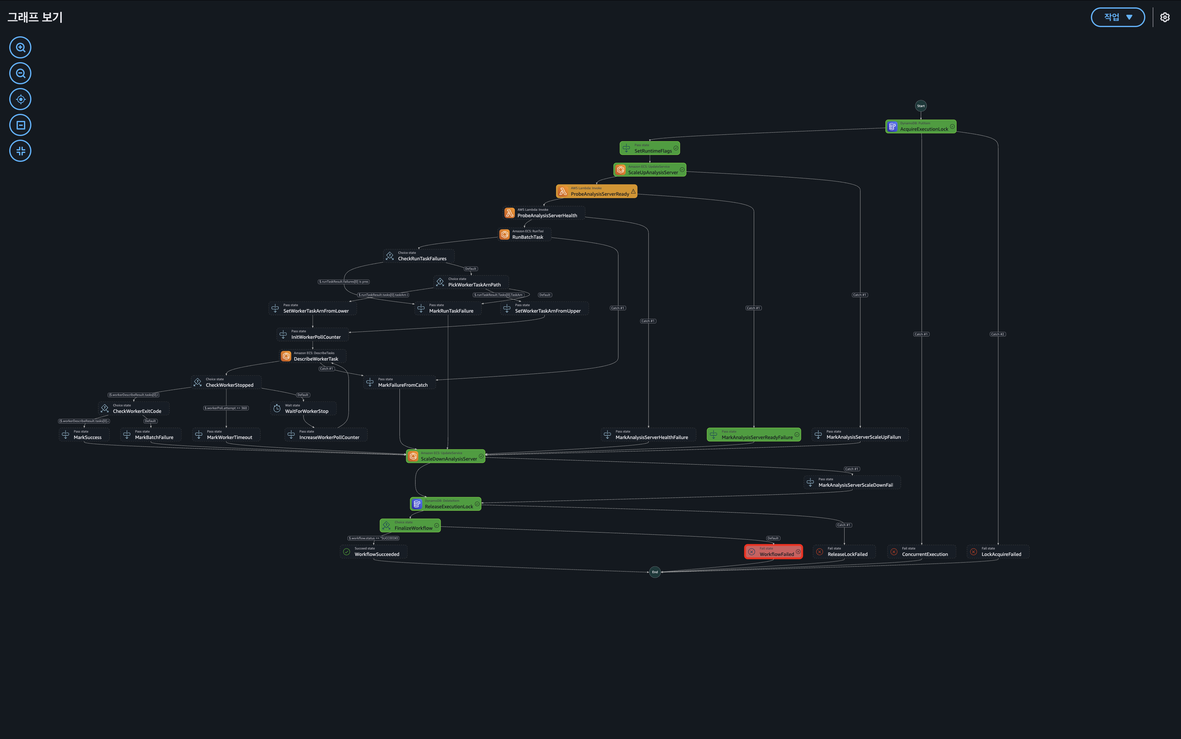 가장 먼저 AWS console - Step Functions 에서 실행 이력을 분석하여 실패 지점을 좁혔다. 전체 워크 플로우 중 배치 실행 단계가 아니라 준비 상태를 확인하는 ProbeAnalysisServerReady 단계에서 에러가 발생했음을 확인했다.
