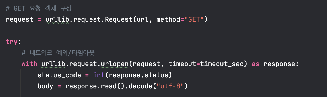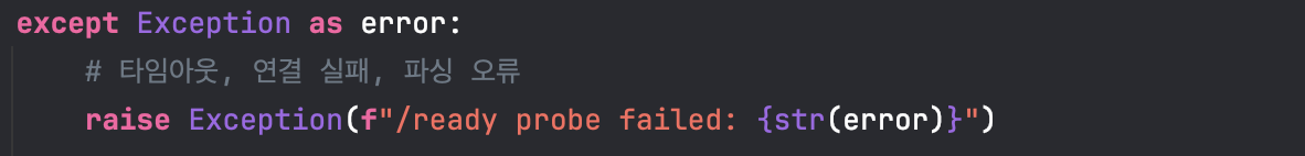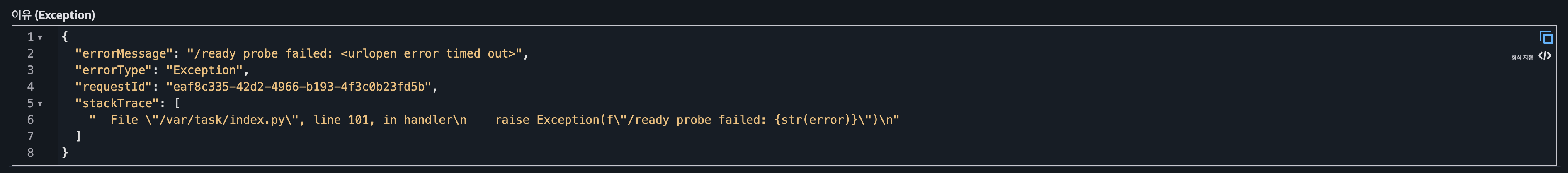 다음으로 정확한 실패 사유를 분석하기 위해 Readiness Probe Lamda 실행 로그를 분석했다. Lamda의 Python-urllib를 이용하여 대상 서버에 GET 요청을 보내고 HTTP 상태 코드 및 Payload의 정합성을 검증하도록 작성했다.