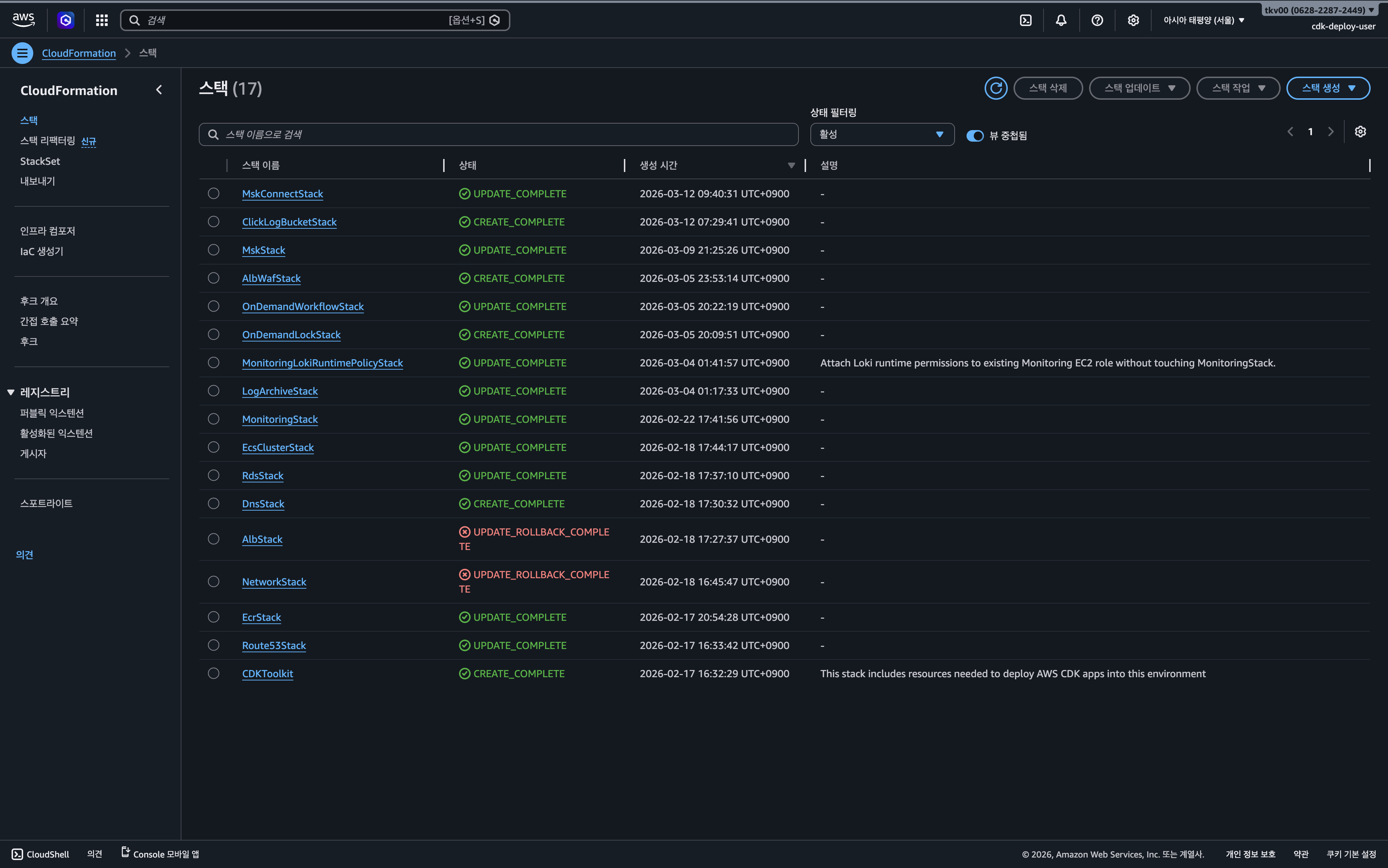 코드에는 존재하는 규칙이 실제 인프라에 반영되지 않은 이유를 찾기 위해 CloudFormation의 스택 배포 상태를 확인했다. 확인 결과, 워크플로우 로직을 담은 OnDemandWorkflowStack은 정상적으로 배포(UPDATE_COMPLETE)되었으나, 네트워크 규칙 변경을 포함하는 NetworkStack은 모종의 이유로 롤백(UPDATE_ROLLBACK_COMPLETE)된 상태였다.