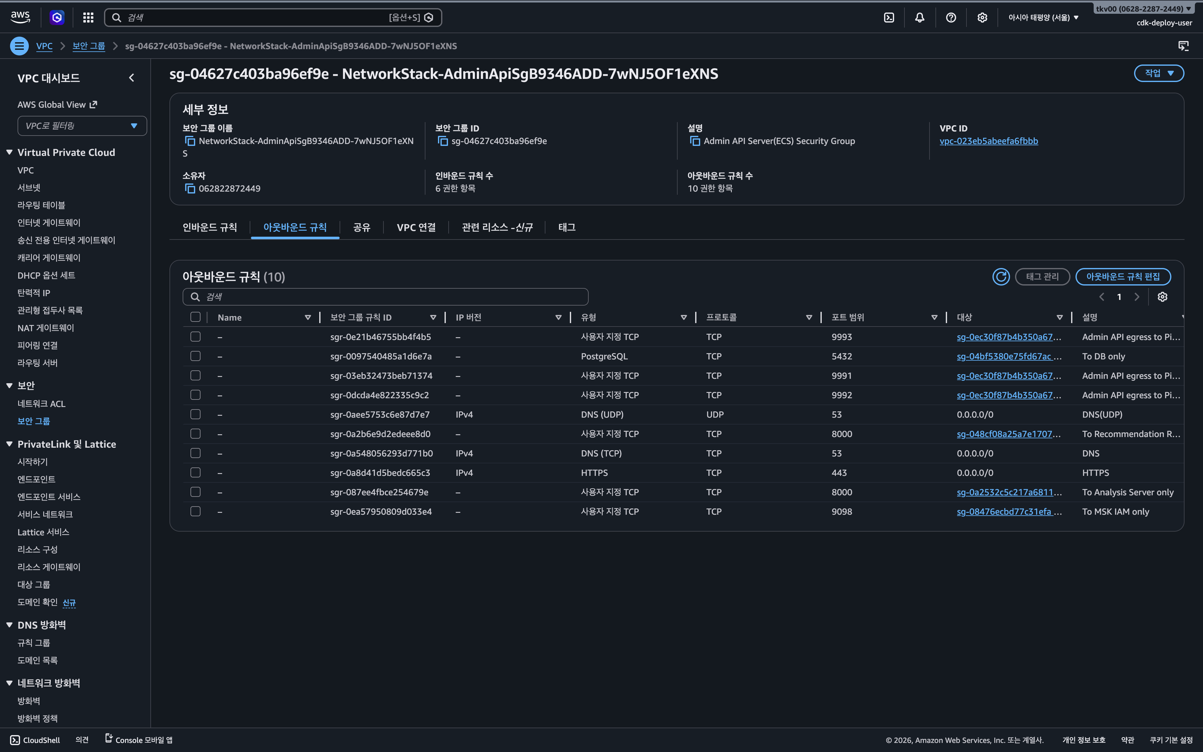 운영 환경의 즉각적인 정상화를 위해, AWS 콘솔을 통해 AdminApiSg에 누락되었던 TCP 8000 아웃바운드 규칙을 수동으로 추가하는 임시 대응을 진행했다.