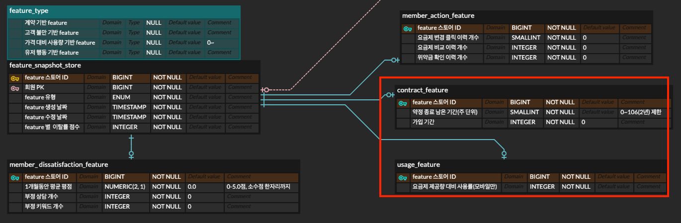 이벤트성 데이터인 상담 내용이나 실시간성 사용자 행동 로그와 달리, 사용자 기본 정보는 실시간으로 크게 변하지 않는다. 하지만 그렇다고 해서 이탈률 계산에서 중요하지 않은 건 아니다 오히려 계약 상태, 이용 기간, 사용량 대비 요금 수준처럼 사용자의 현재 상태를 보여주는 정보는 이탈률을 해석하는 기본 축에 가까웠다.
