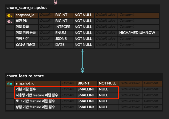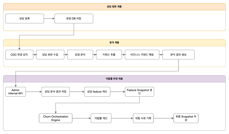 결국 상담 데이터는 7일 단위 배치 반영이 아니라, 상담이 생성되거나 분석 결과가 확정되는 시점에 이벤트성으로 이탈률에 반영하는 방향으로 설계를 변경했다.