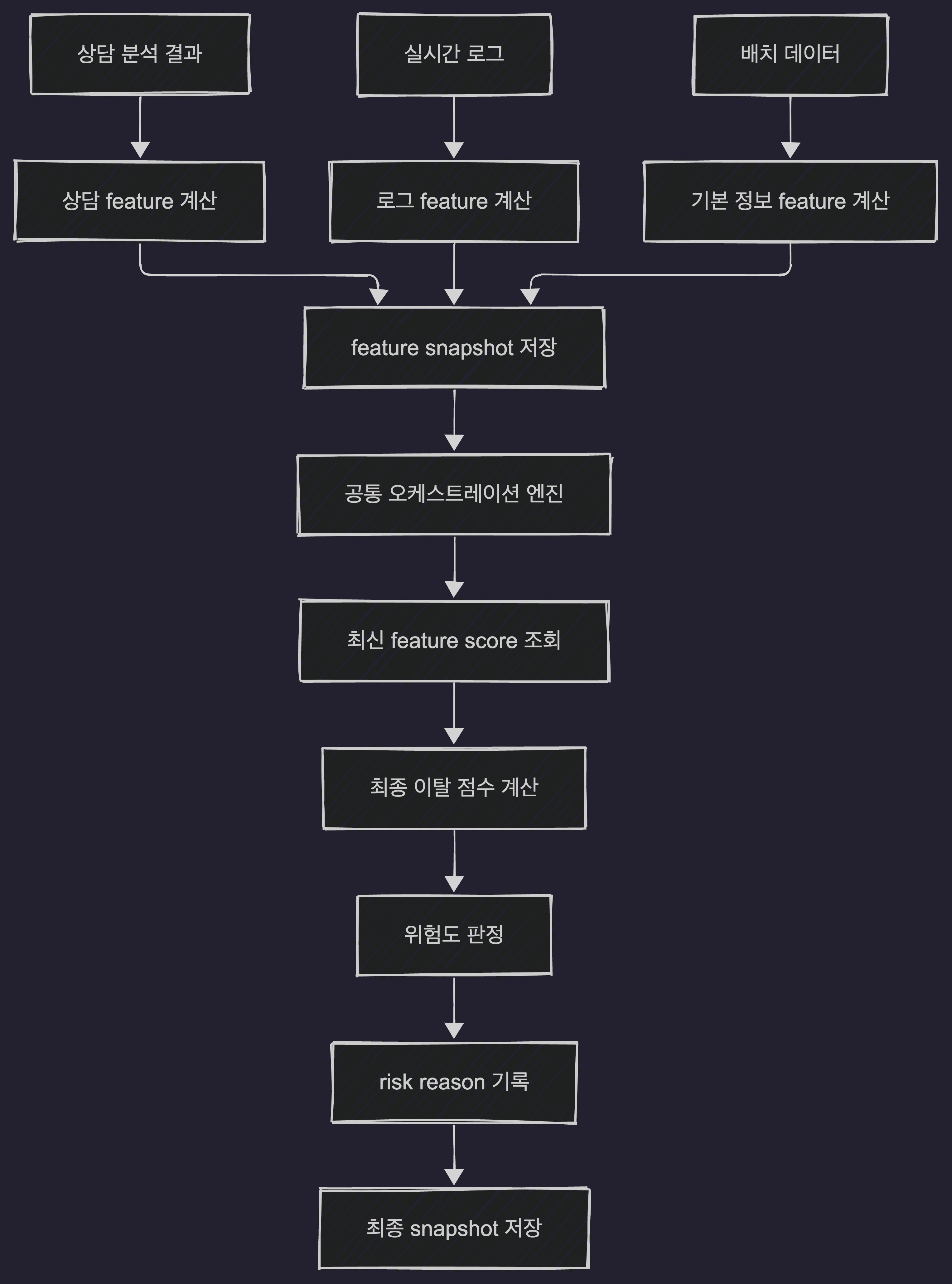 입력 이벤트가 최종 이탈률을 덮여쓰지 않는다. 각 입력 파이프라인은 먼저 자신이 담당하는 Feature만을 계산하고, feature_snapshot_store를 갱신한다. 그 다음 공통 오케스트레이션 계층이 최신 Feature 점수를 다시 읽어 최종 이탈률과 위험 사유를 저장한다.