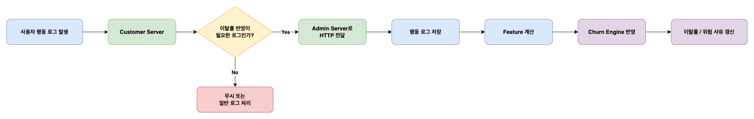 반면 Admin Server는 이러한 사용자 인터랙션의 세부 맥락까지 모두 알 필요는 없다. Admin Server는 이미 가공된 “이탈 관련 행동 신호”를 전달받고, 이를 기반으로 feature 계산, 점수 산정, 위험 사유 기록, snapshot 저장에 집중하는 책임만을 가지면 된다.