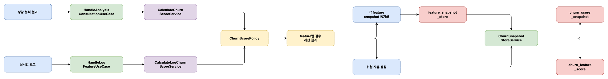 이 구조를 설계할 때 가장 중요하게 본 것은, 상담, 로그, 배치 데이터가 모두 서로 다른 방식으로 들어오더라도 마지막에는 같은 방식으로 이탈률을 계산해야 한다는 점이었다. 왜냐하면 입력 방식이 다르다고 해서 최종 점수 계산 로직까지 제각각이 되면, 나중에 기능이 늘어날수록 코드가 빠르게 복잡해지기 때문이다. 그래서 입력은 각자 다르게 처리하되, 계산은 하나의 엔진으로 모으는 구조를 만들었다.