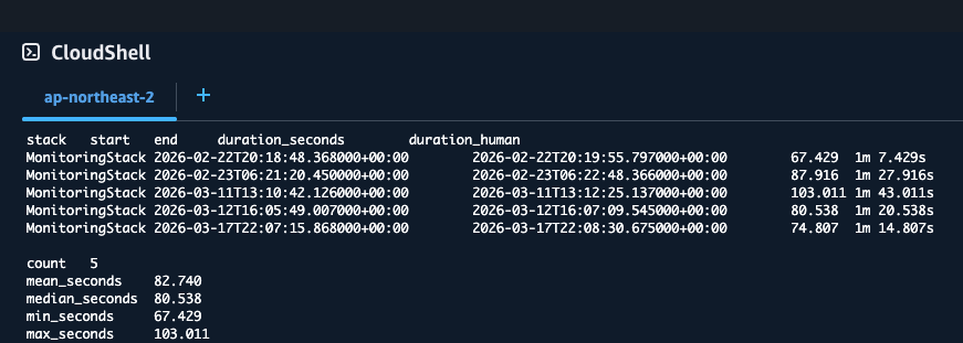 배포 시간은 AWS CloudFormation/ECS의 원본 이벤트 시각을 기준으로 산출했다. CloudFormation은 stack의 UPDATE_IN_PROGRESS와 UPDATE_COMPLETE 차이를 사용했고, ECS는PRIMARY deployment createdAt과 steady state이벤트 차이를 사용했다.