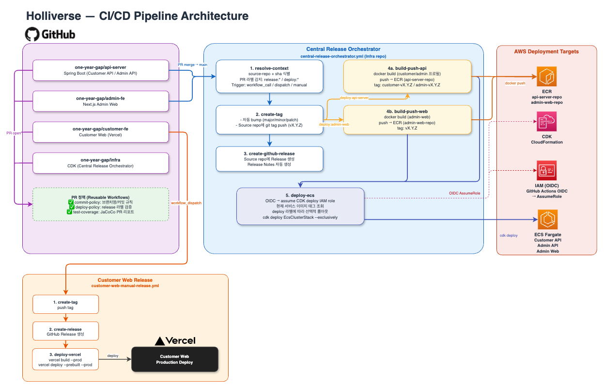 Holliverse도 구조적으로는 “하나의 앱”이라기보다 여러 역할을 가진 서비스들의 묶음에 가까웠다. 그래서 배포를 개별 서비스 저장소의 책임으로 두기보다는, 중앙 저장소가 정책과 배포 흐름을 해석하는 구조가 더 적합하다고 판단했다.