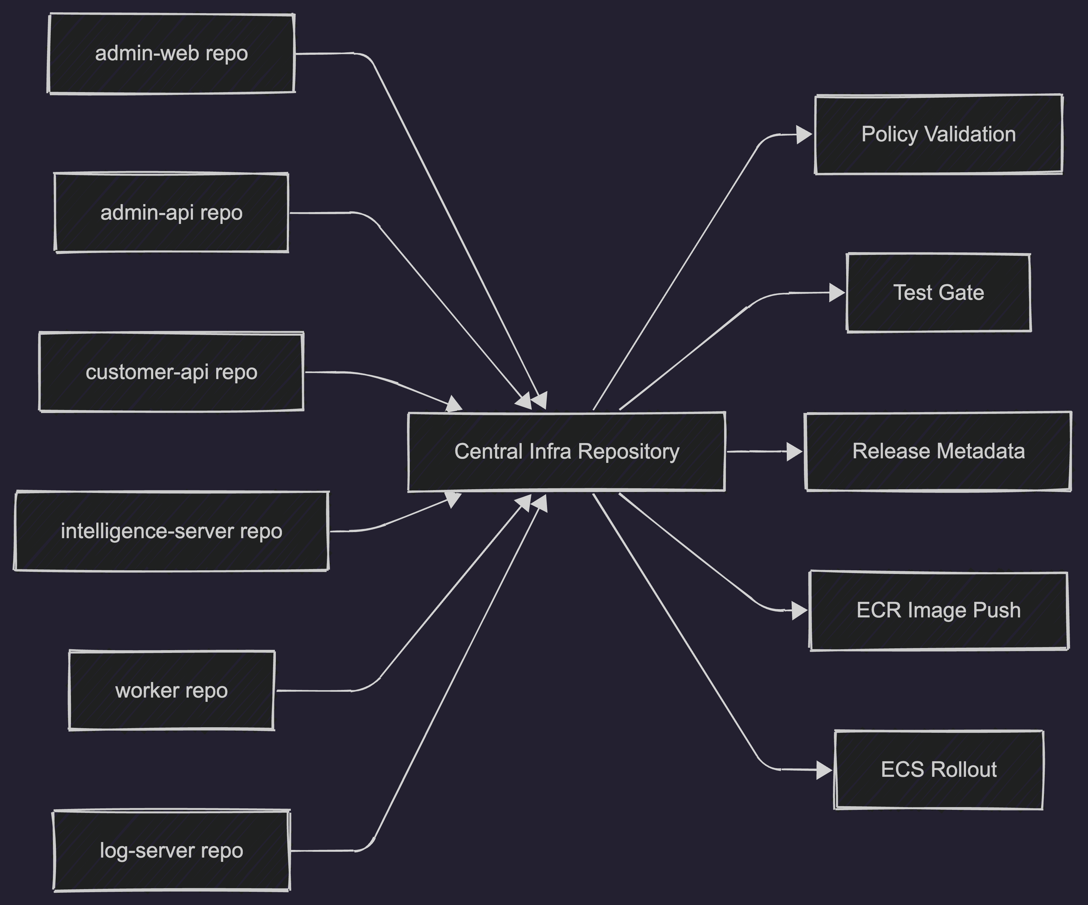 각 서비스 레포지토리에서 ECR 이미지 업로드와 ECS 배포까지 모두 관리하게 할지, 아니면 중앙 인프라 저장소 하나가 이를 해석하고 실행하도록 만들지. 내가 선택한 방향은 후자였다.