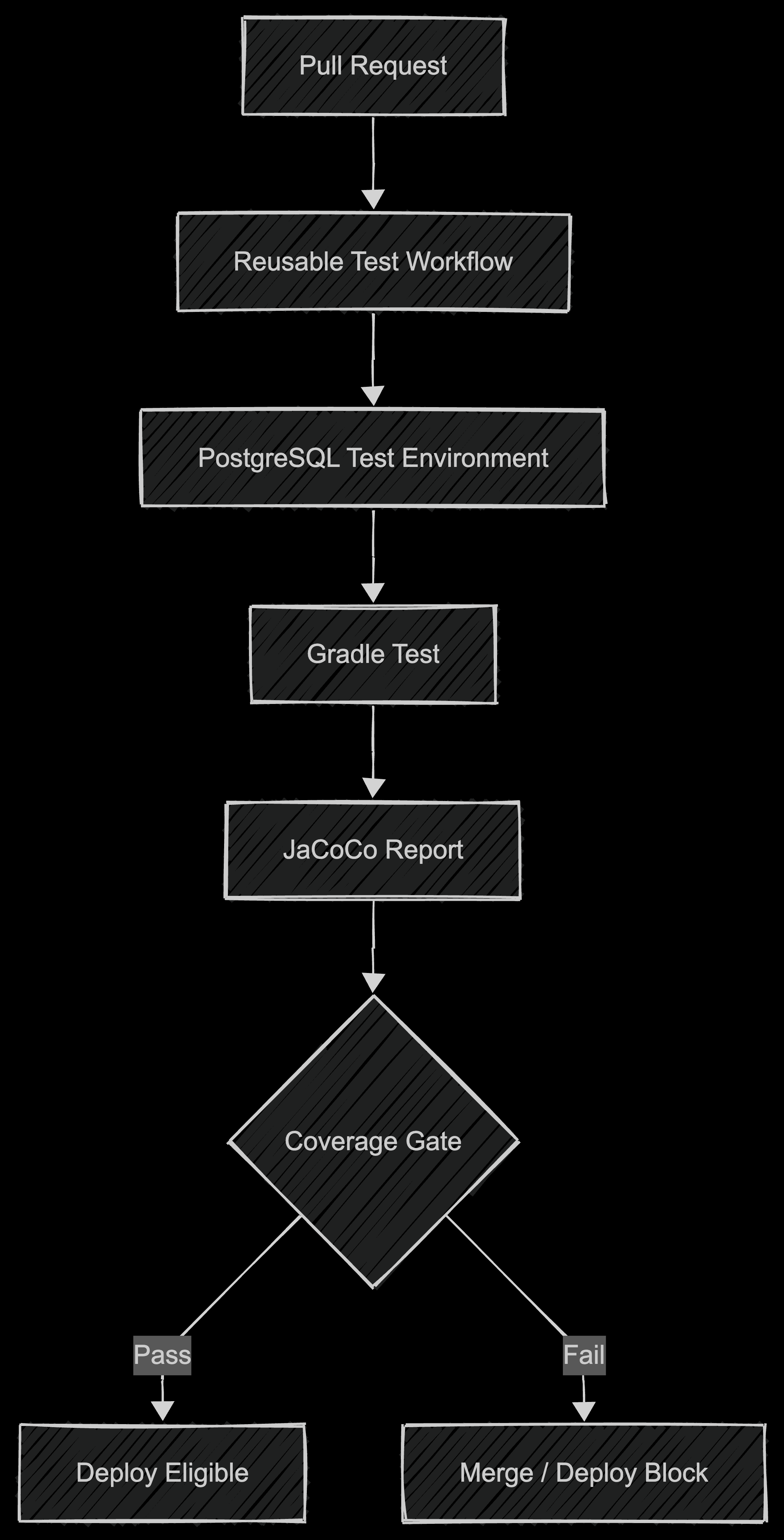현재 공통 테스트 워크플로는 reusable workflow 기반으로 묶여 있고, PostgreSQL 기반 테스트 환경을 구성한 뒤 Gradle 테스트 실행, JaCoCo 리포트 생성, 전체 커버리지와 변경분 커버리지를 평가하는 구조로 되어 있다.