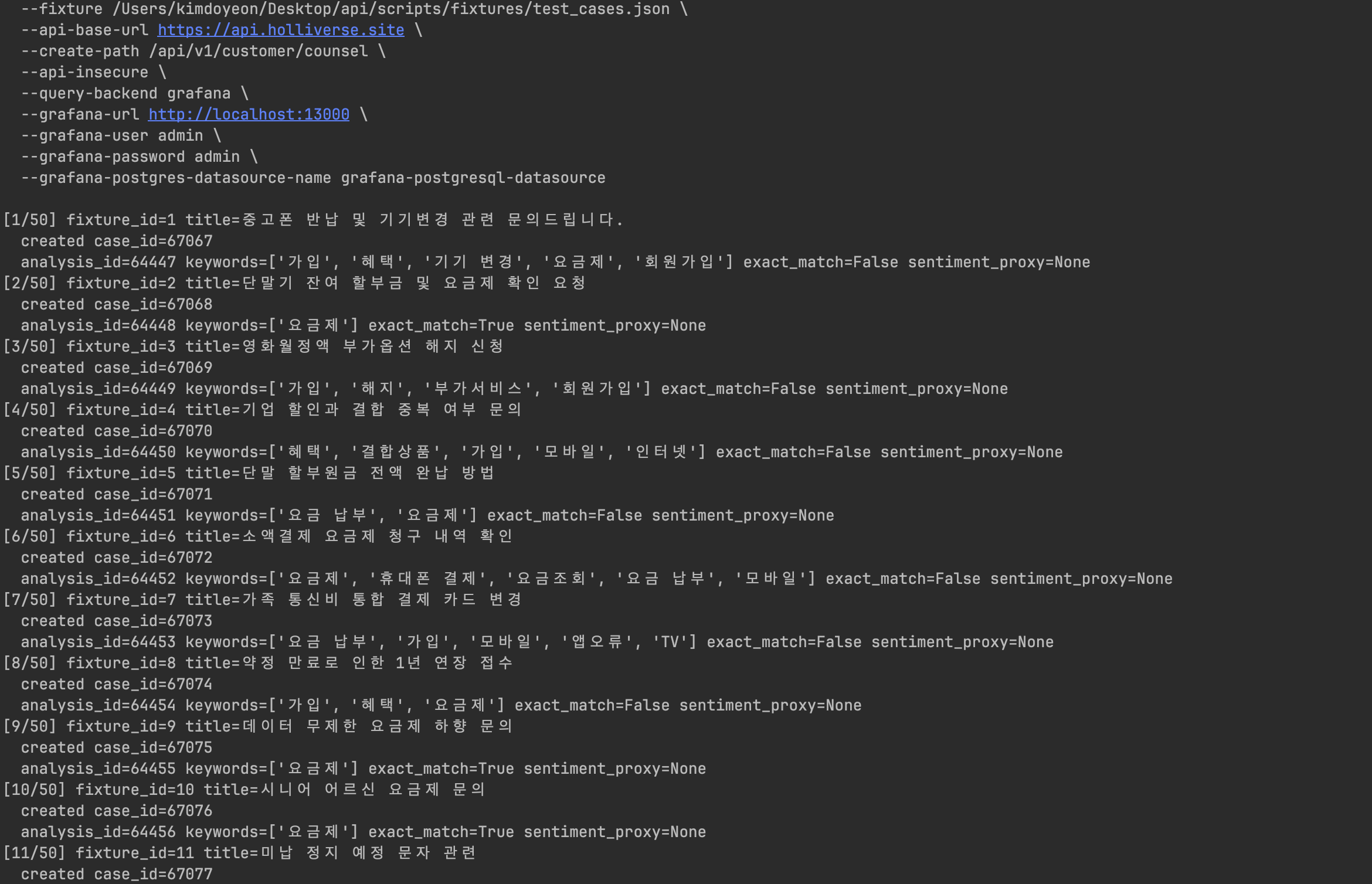 테스트는 라벨링된 상담 fixture를 실제 customer counsel API로 생성한 뒤, 후속 분석 결과를 조회하여 리포트를 생성하는 방식으로 진행하였다. 전체 테스트 케이스는 50건이며, 모든 케이스가 정상 완료되었다. 실패 케이스와 분석 타임아웃 케이스는 발생하지 않았다.