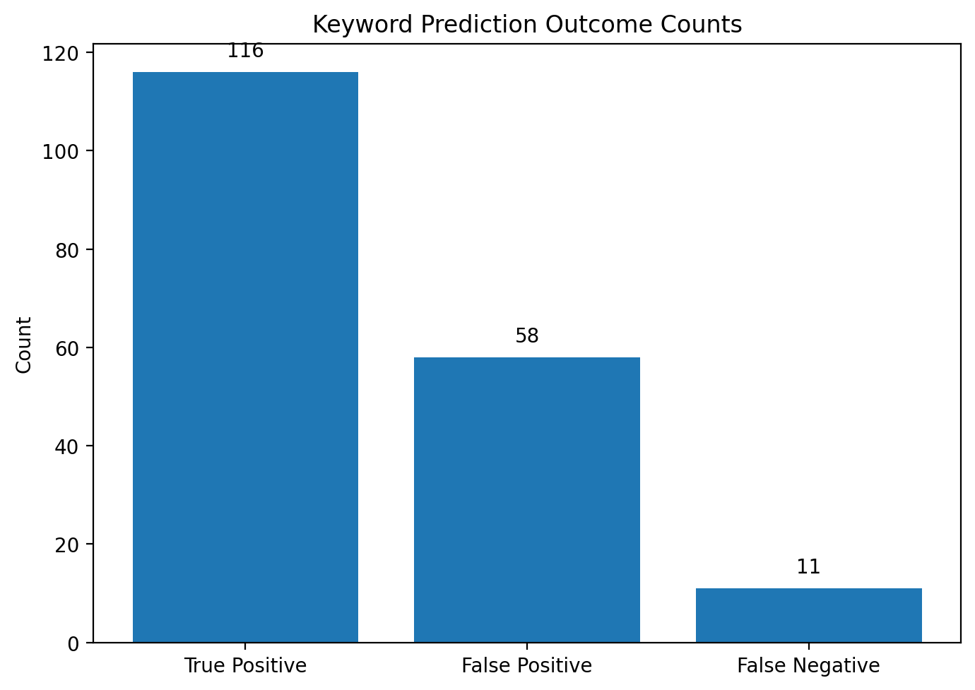 True Positive는 116건, False Positive는 58건, False Negative는 11건이었다. False Negative가 상대적으로 작고 False Positive가 크게 나타난 점은 현재 시스템이 정답을 놓치기보다는 다소 넓게 추출하는 성향을 가진다는 것을 의미한다.