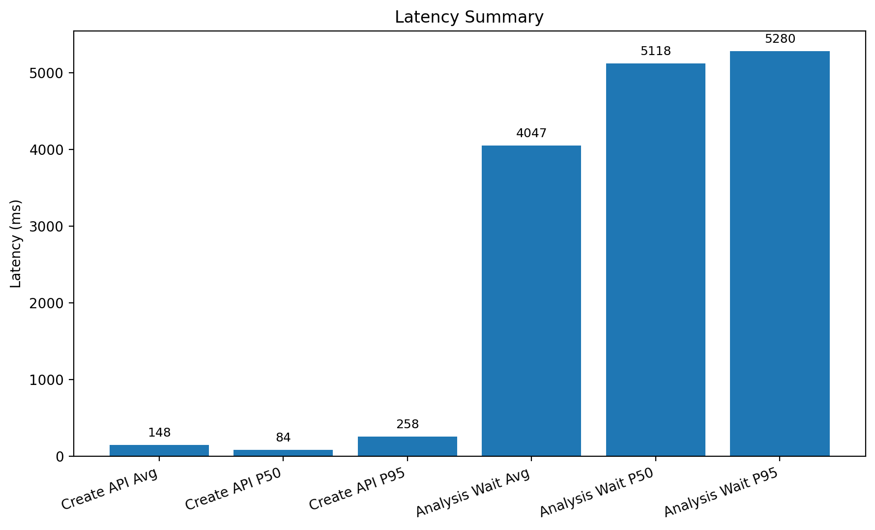 반면 분석 결과가 생성될 때까지의 대기 시간은 평균 4047.12ms, P50은 5118ms, P95는 5280.25ms였다. 즉, 실제 사용자 체감 기준으로는 생성 API보다 분석 완료까지의 비동기 구간이 더 큰 영향을 준다.